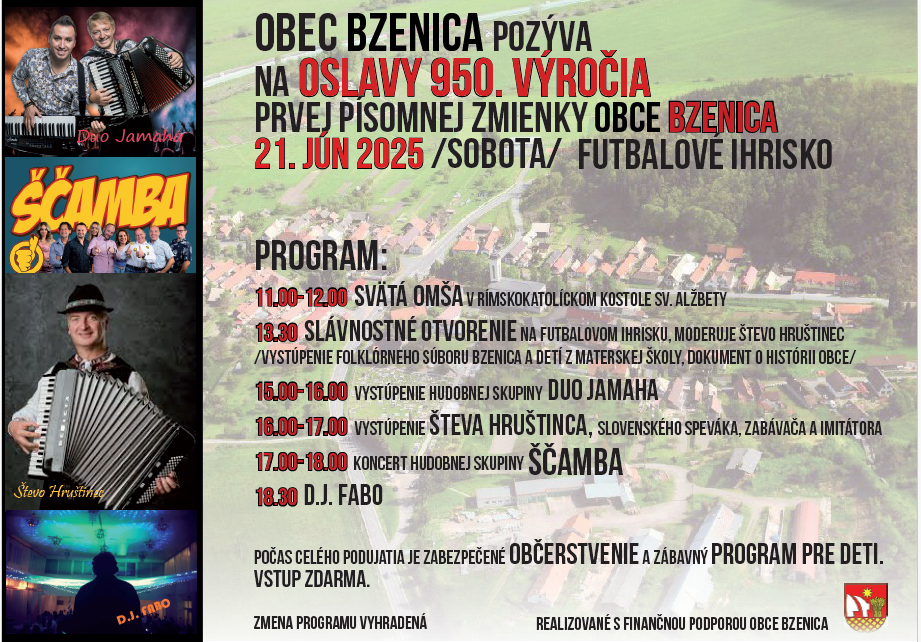 950. výročie prvej písomnej zbierky našej obce Pridané do 29 apríla, 2025 od bzenica Oslávme spoločne významné výročie našej obce! Obec Bzenica Vás srdečne pozýva na oslavy 950. výročia prvej písomnej zmienky o obci, ktoré sa uskutočnia dňa 21. júna 2025 (sobota) na futbalom ihrisku.