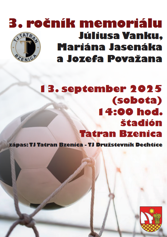 Obec Bzenica a TJ Tatran Bzenica pozývajú na 3. ročník memoriálu Júliusa Vanku, Mariána Jasenáka a Jozefa Považana, ktorý sa koná v sobotu 13. septembra od 14:00 na ihrisku Tatranu Bzenica. Futbalovým zápasom s výberom TJ Družstevník Dechtice si uctíme nielen tri menované osobnosti bzenického futbalu, ale oslávime aj 49. výročie družby s obcou Dechtice a jej futbalovým klubom.