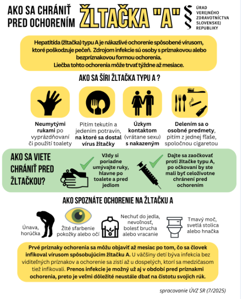 Upozornenie na epidemiologickú situáciu Pridané do 28 júla, 2025 od bzenica Regionálny úrad verejného zdravotníctva eviduje nárast počtu prípadov chorých na žltačku typu A. Prosím venujte pozornosť priloženým informáciám.