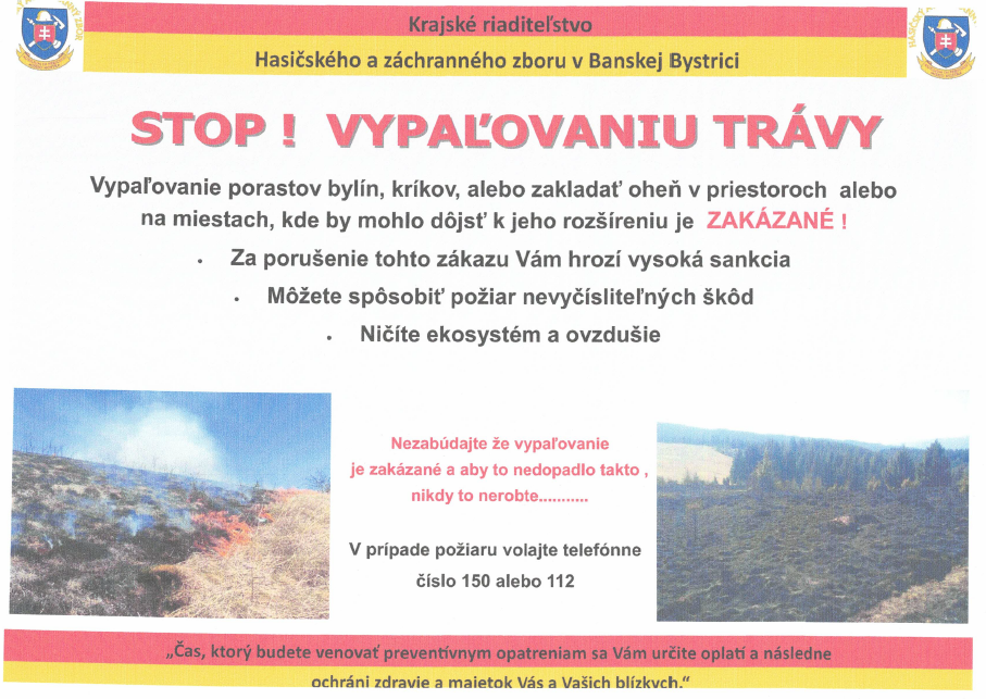 Výzva hasičov – STOP vypaľovaniu trávy Pridané do 17 marca, 2025 od bzenica Hasičský a záchranný zbor upozorňuje občanov na zákaz vypaľovania porastov a zakladania ohňa na miestach, kde by mohlo dôjsť k jeho rozšíreniu.